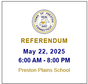 As per our Town Meeting on May 8, 2025; the polls for voting at the Referendum on May 22, will begin at 6:00 AM to 8:00 PM, at Preston Plains Middle School. Preston residents will vote on the proposed Fiscal Year 2025-2026 Budget.