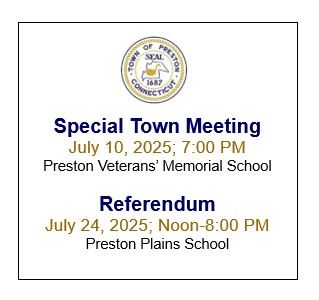 A Special Town Meeting will be held on July 10, 2025, at 7pm, at Preston Veterans' Memorial School. The Referendum will be on July 24, 2025, 12noon to 8pm, at Preston Plains Middle School. Links to the full proposed budgets are included in this notice.