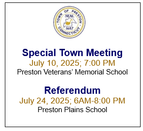 A Special Town Meeting will be held on July 10, 2025, at 7pm, at Preston Veterans' Memorial School. The Referendum will be on July 24, 2025, 6am to 8pm, at Preston Plains Middle School. Links to the full proposed budgets are included in this notice.