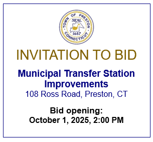 The Town of Preston is soliciting sealed bids for completing improvements to our Transfer Station located at 108 Ross Road. Sealed bids will be received at the First Selectwoman's office at the Town Hall, 389 Route 2, Preston, until 2pm on Oct. 1, 2025.